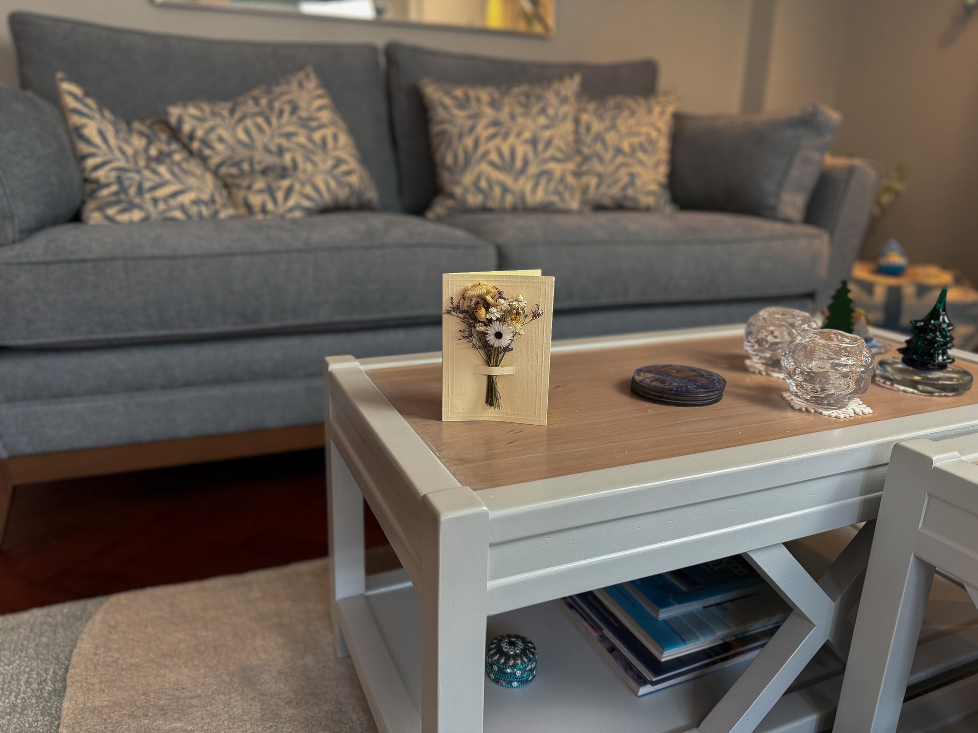 Materials: High quality 250gsm textured card with hand embossed frame and quality 140gsm insert paper to write your message. Real dried flowers. Presented in a kraft gift box with acetate window.