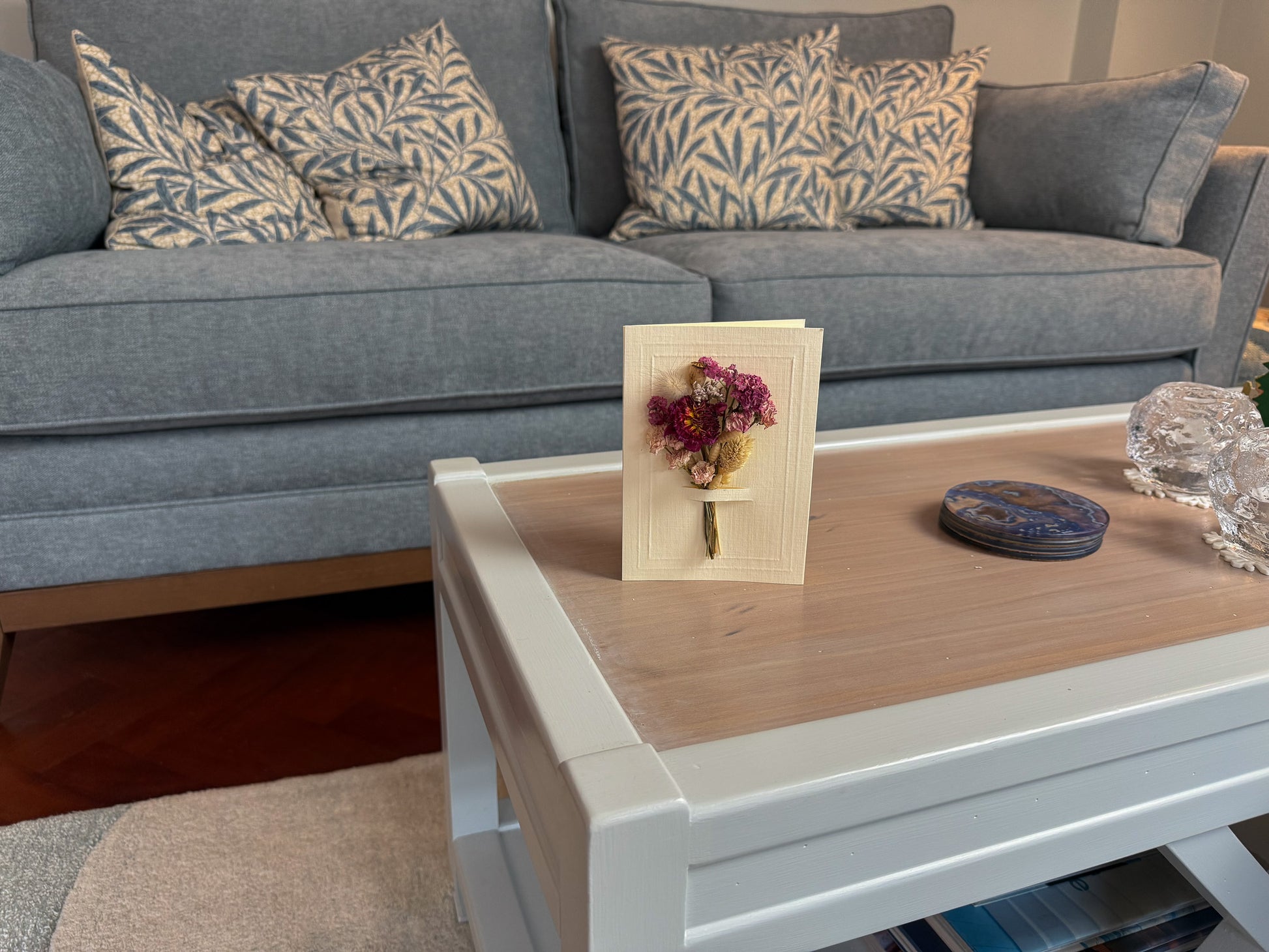 Materials: High quality 250gsm textured card with hand embossed frame and quality 140gsm insert paper to write your message. Real dried flowers. Presented in a kraft gift box with acetate window.
