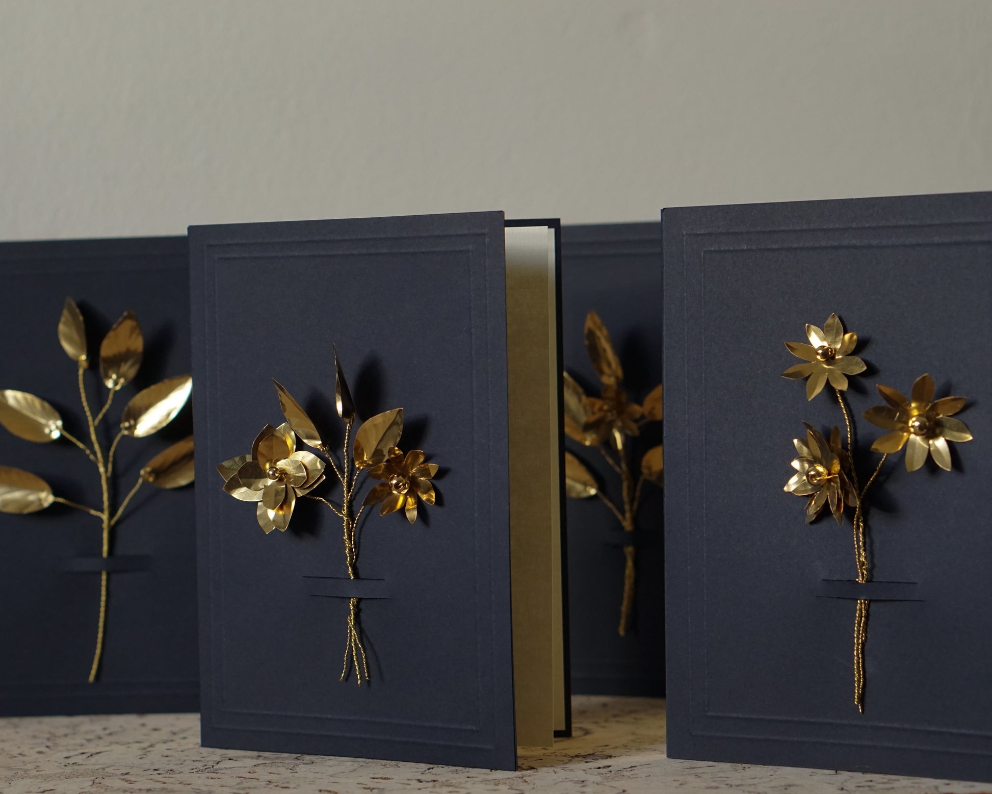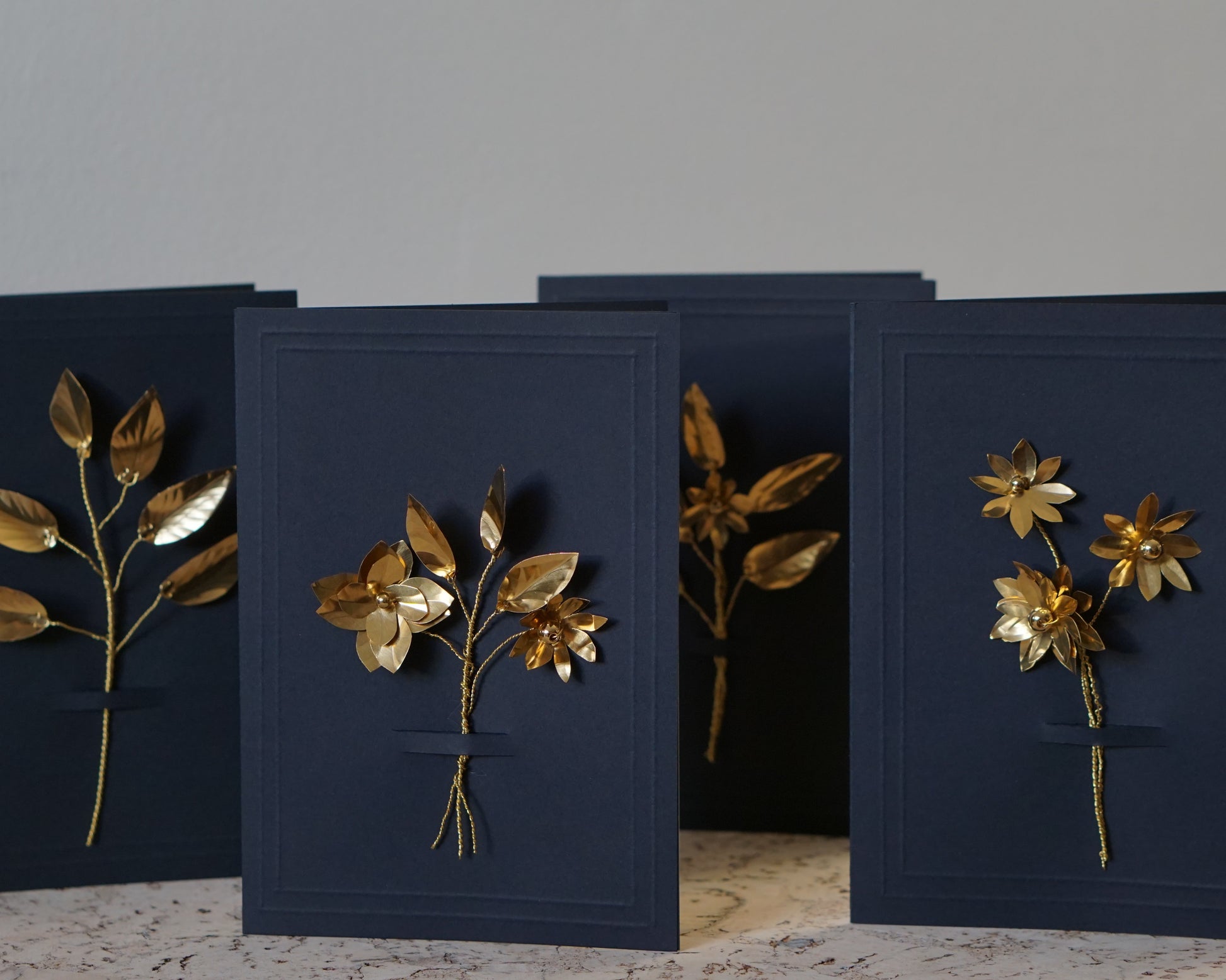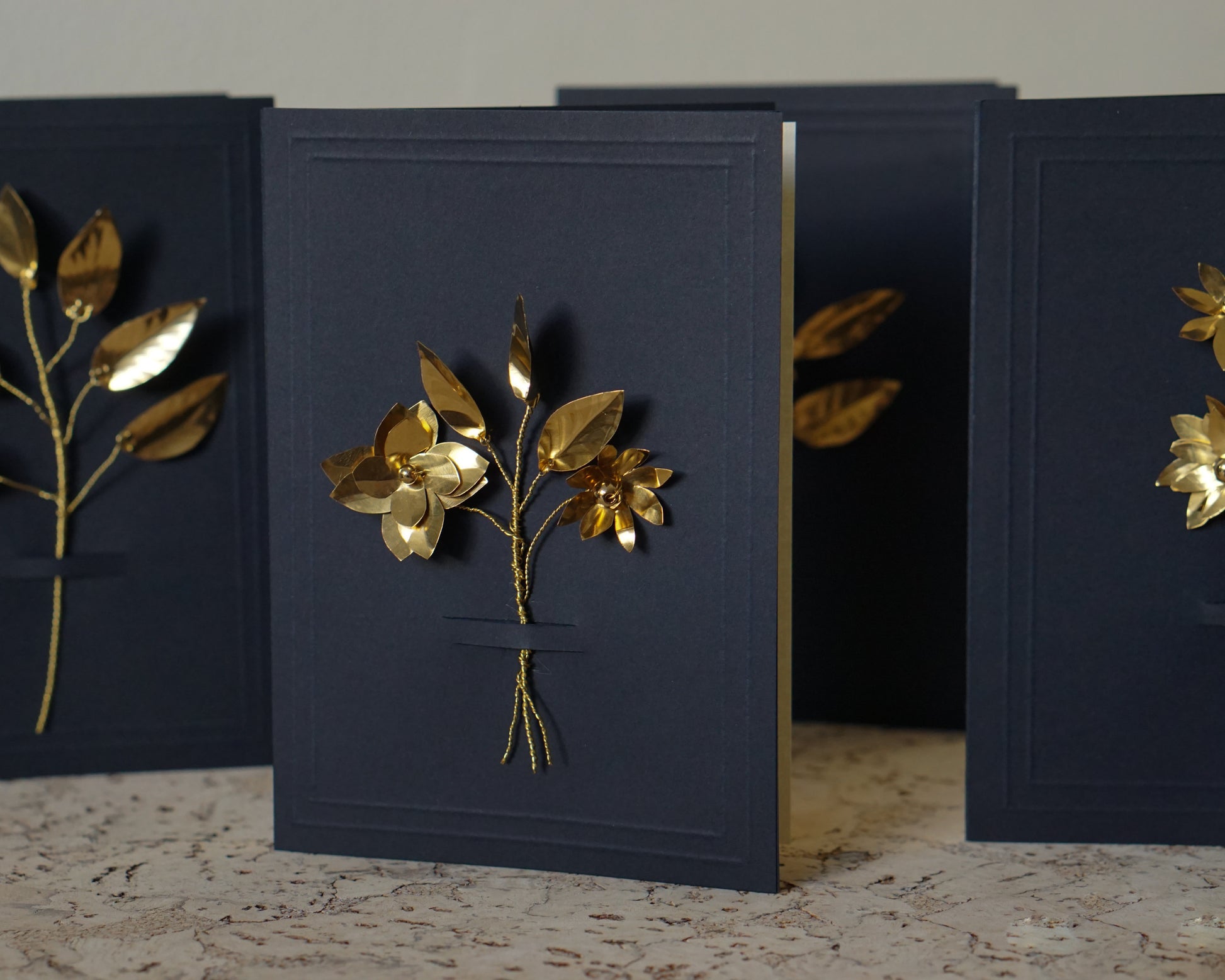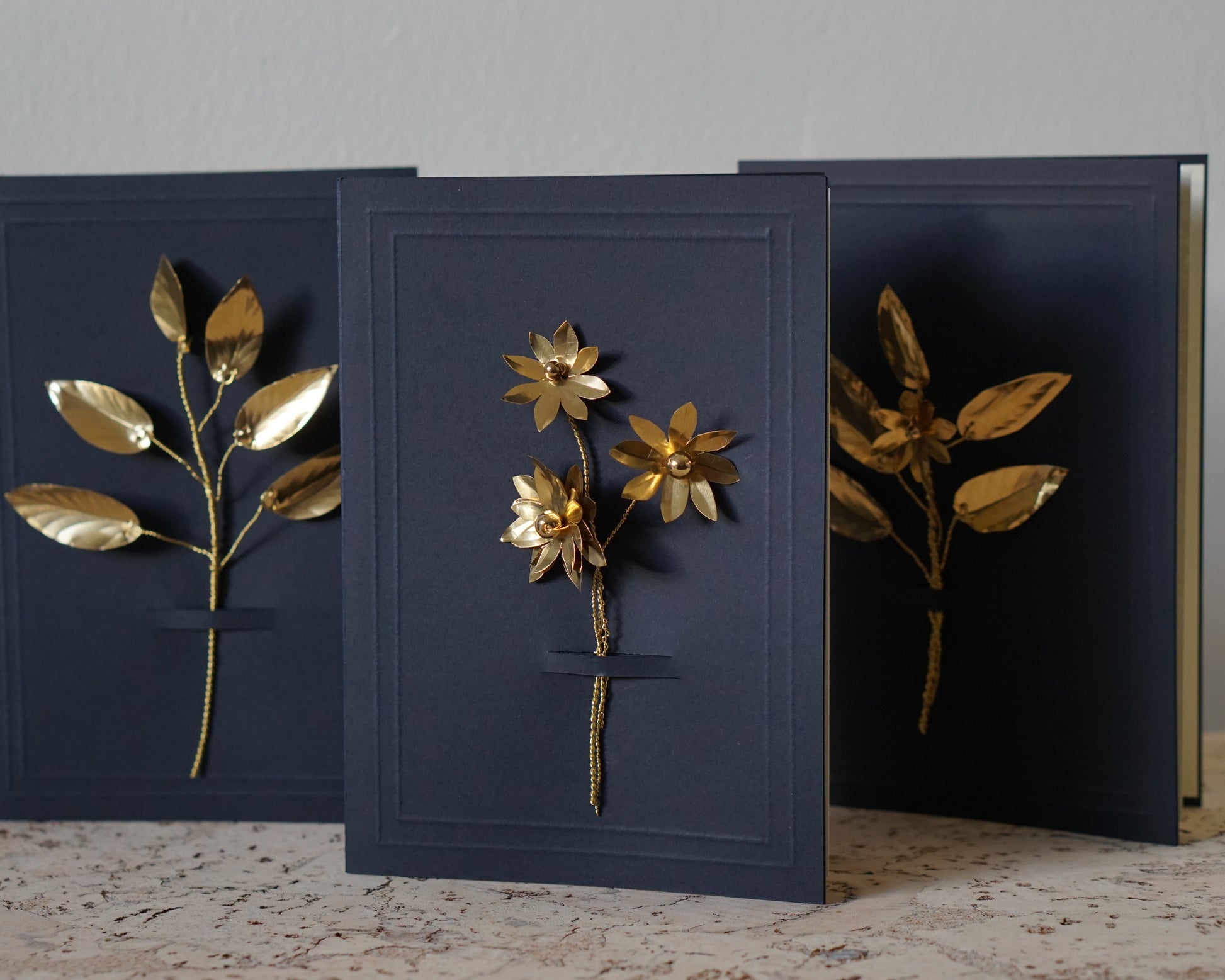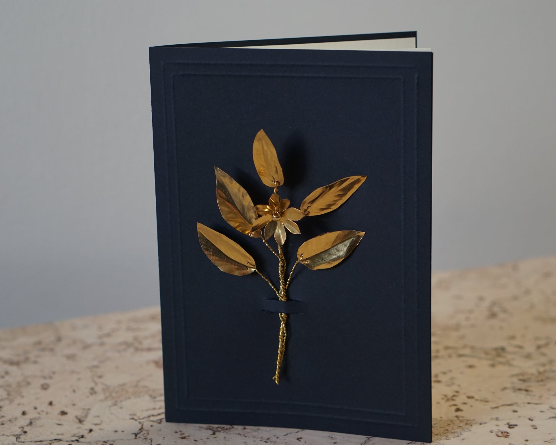 Materials: High quality 250gsm textured card with quality 140gsm insert paper to write your message. Handmade brass leaves and flowers. Presented in a kraft gift box with acetate window.