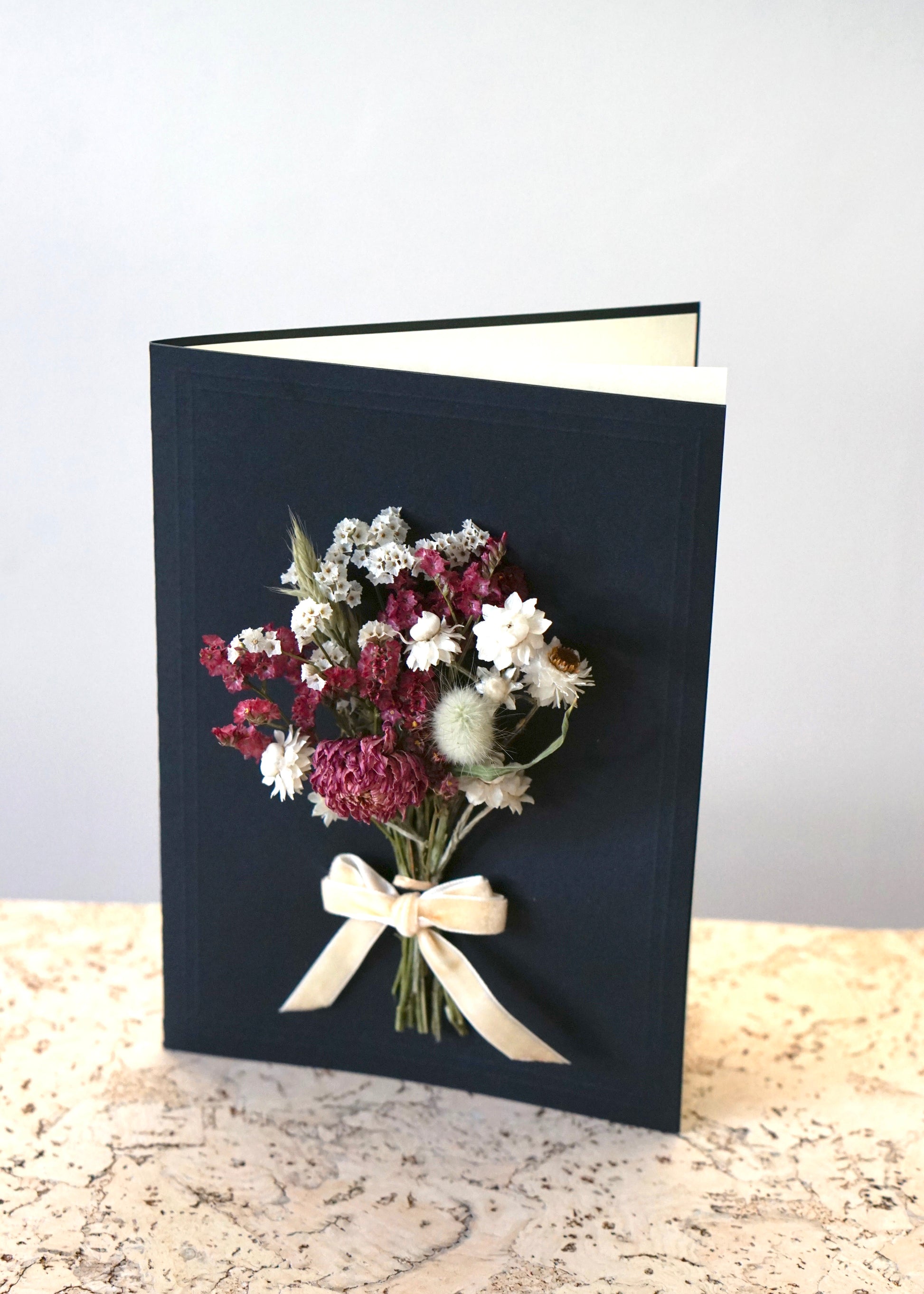 Large A5 Handmade Dried Flower Bouquet Greeting Card - Pink Dahlia Bunch with Ivory Velvet Bow - Boxed