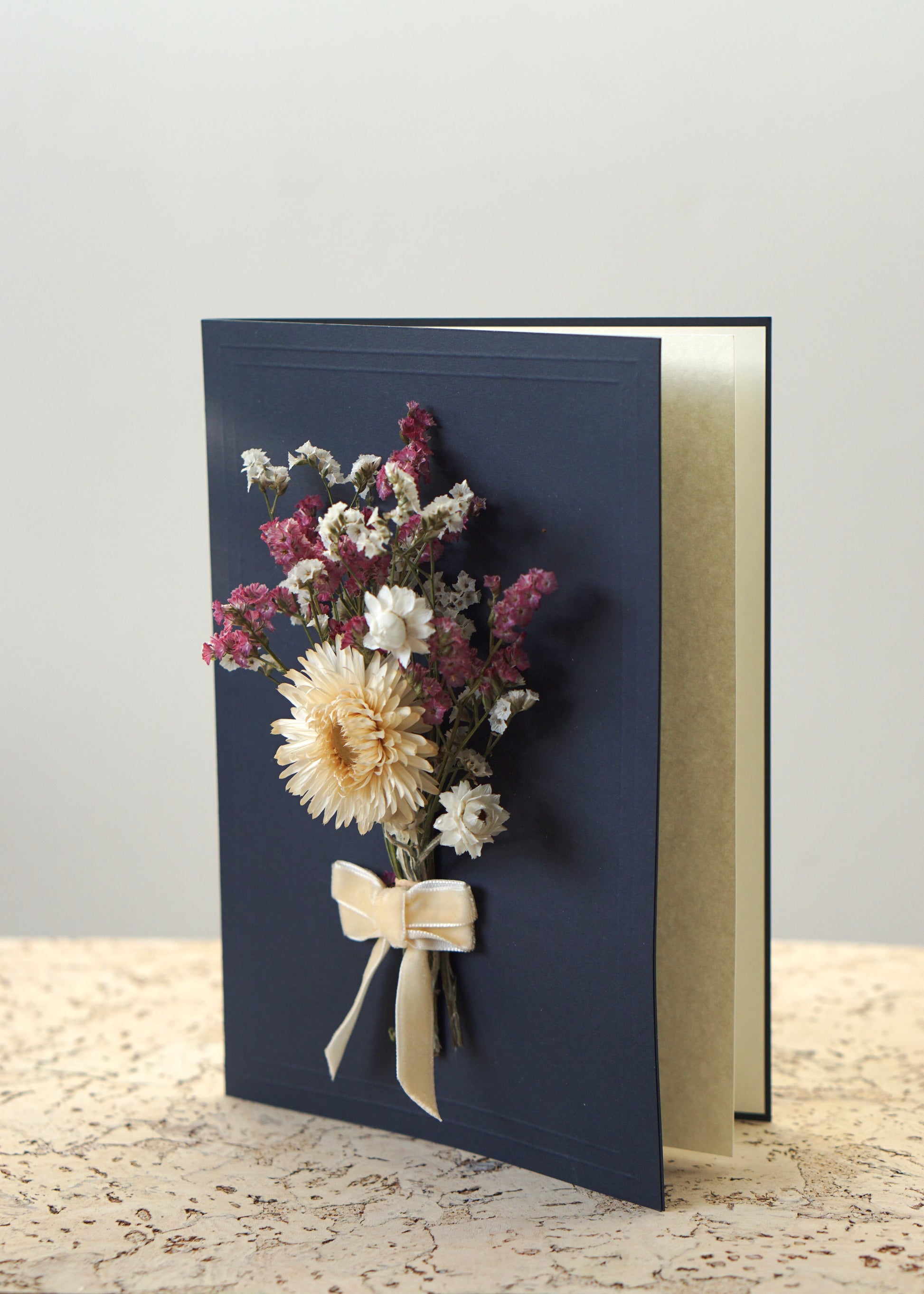Large A5 Handmade Dried Flower Bouquet Greeting Card - White Strawflower & Ivory Velvet Bow - Boxed