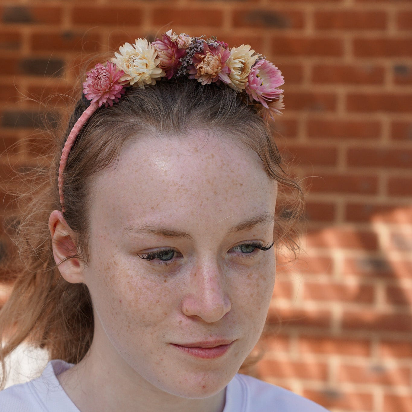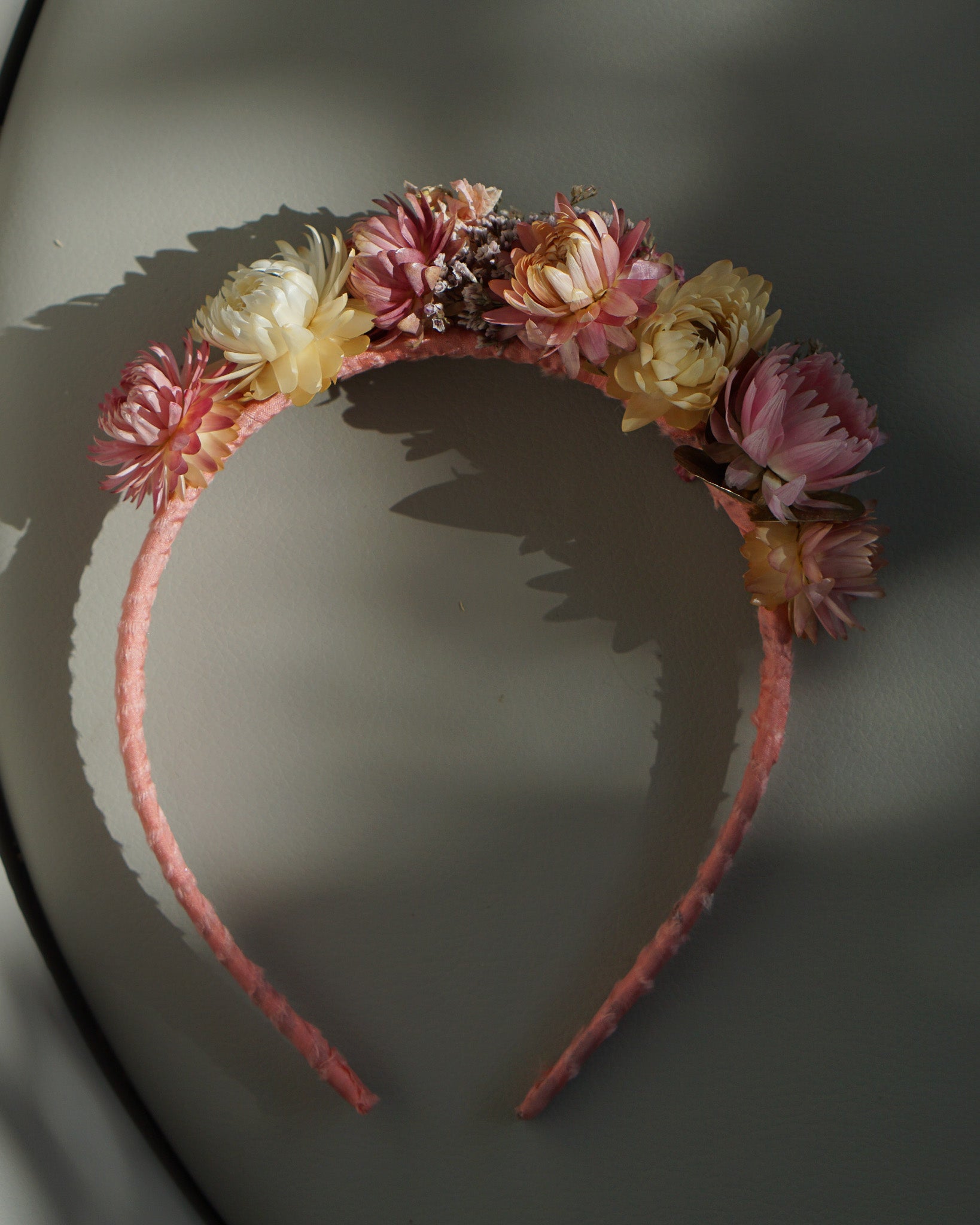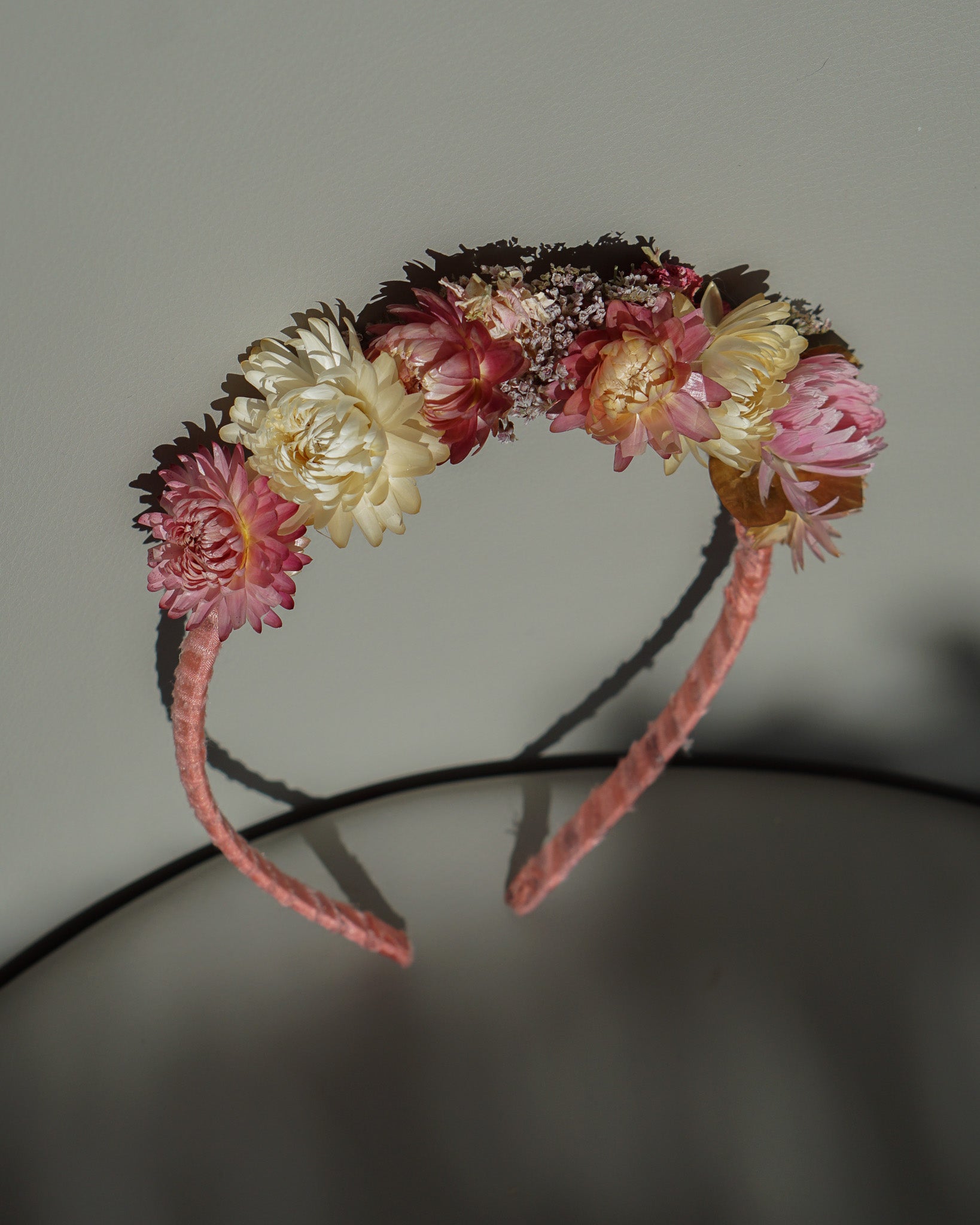 Pretty in pink - a bright and cheerful hairband with dried strawflowers and wrapped in botanically hand-dyed pink silk ribbon. The flowers have been naturally dried.