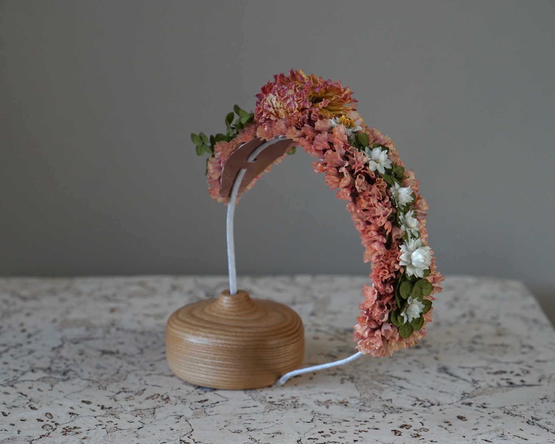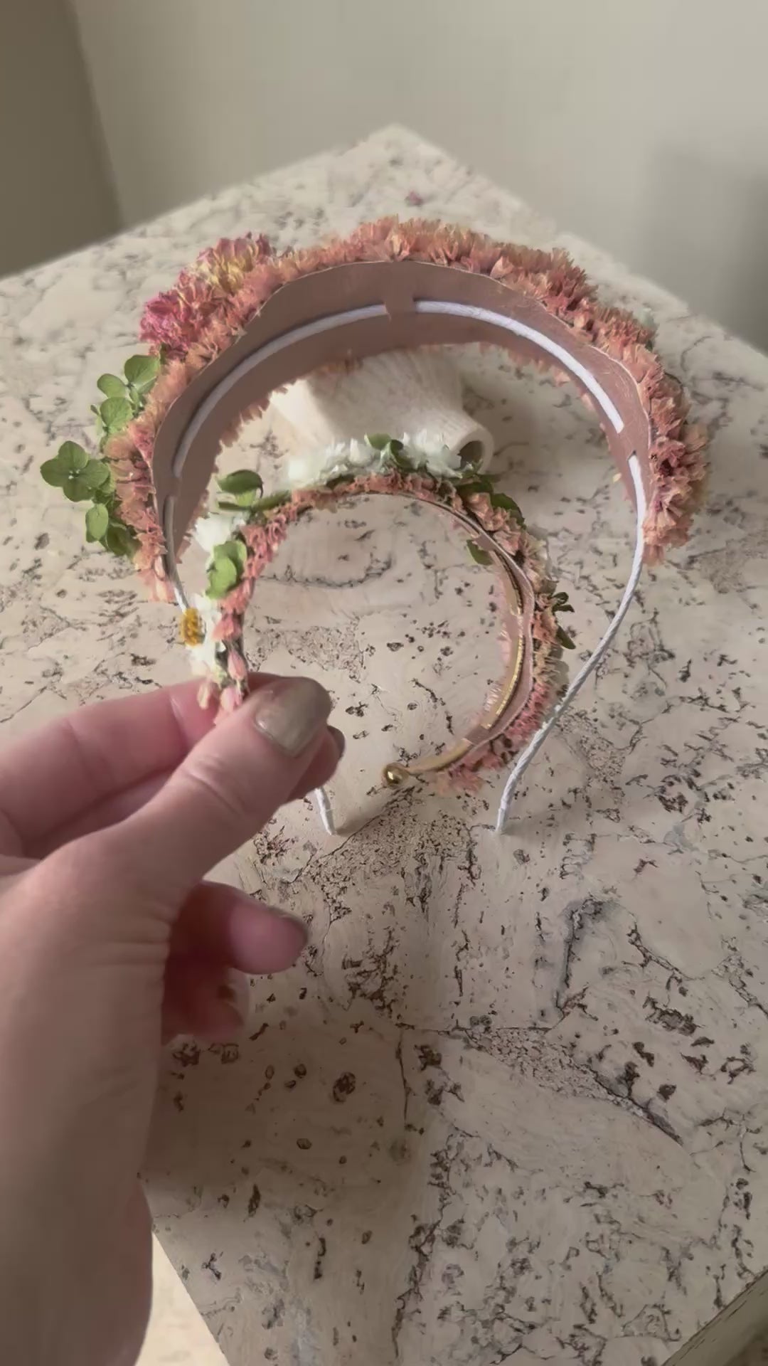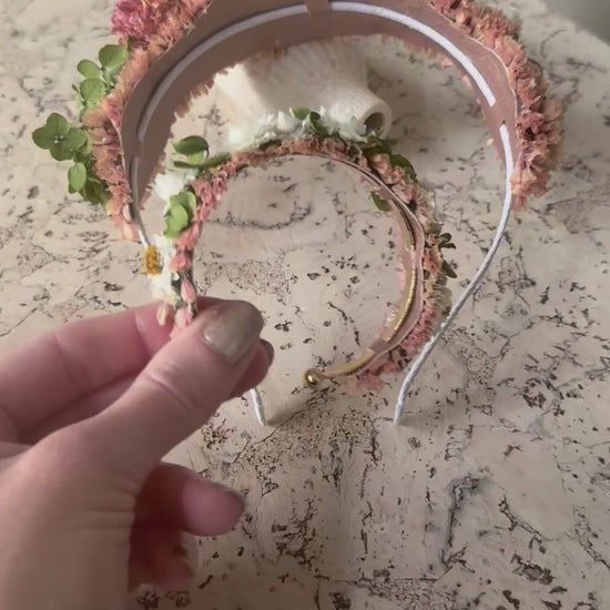 Super comfy and beautiful - this headband and bracelet set in peach, green and white are sure to turn heads. Sturdy and secure, the headband is on a satin and faux leather base, the bracelet on a metal and faux leather base. Designed for adults, but will also fit older children.