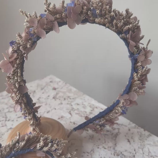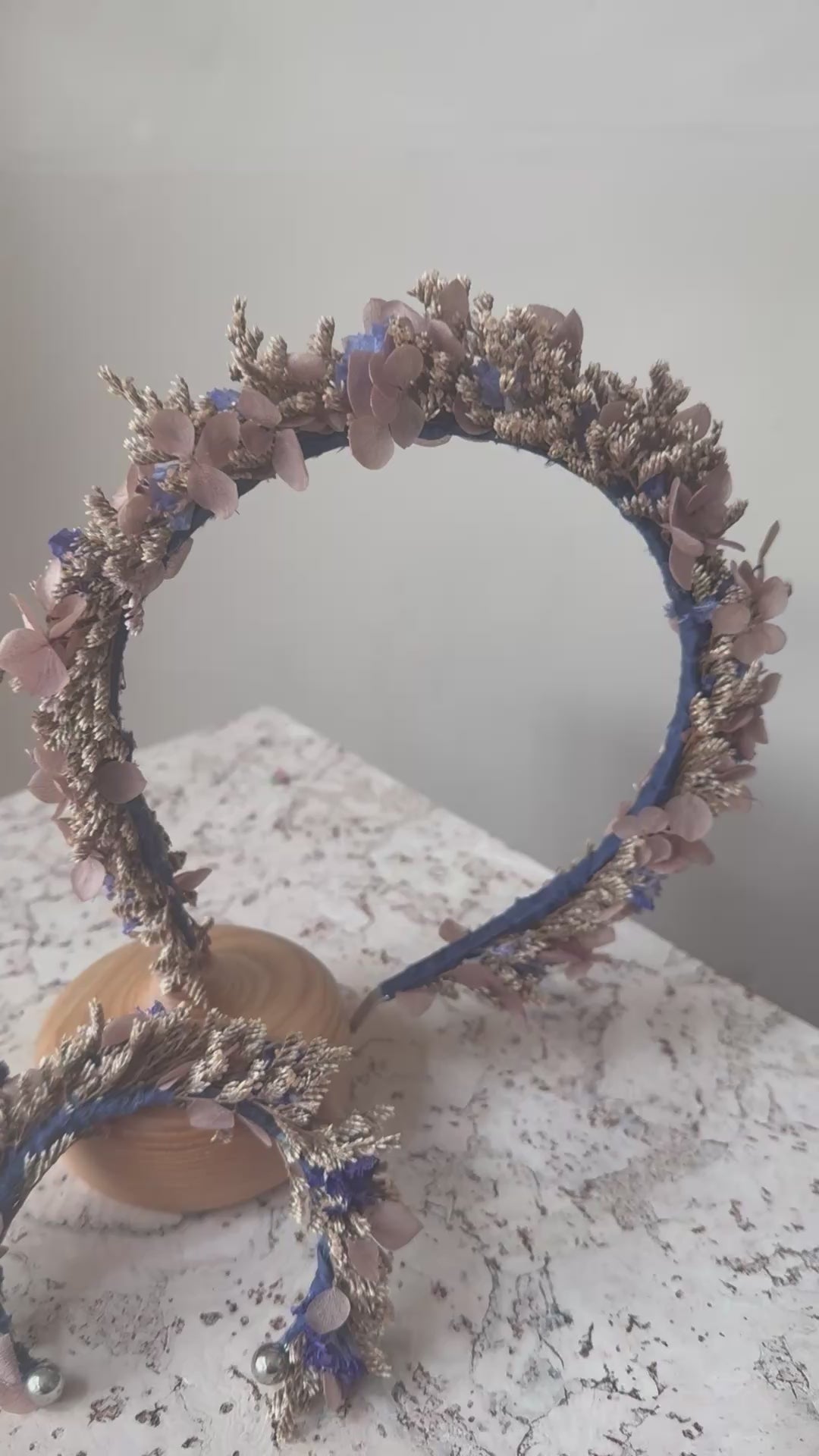 Luxury silk wrapped headband and bracelet set in navy blue and tan are sure to turn heads. The headband is made of both dried and preserved flowers that have been chosen for their long lasting durability, wrapped in luxury hand-dyed navy blue silk. Designed for adults.