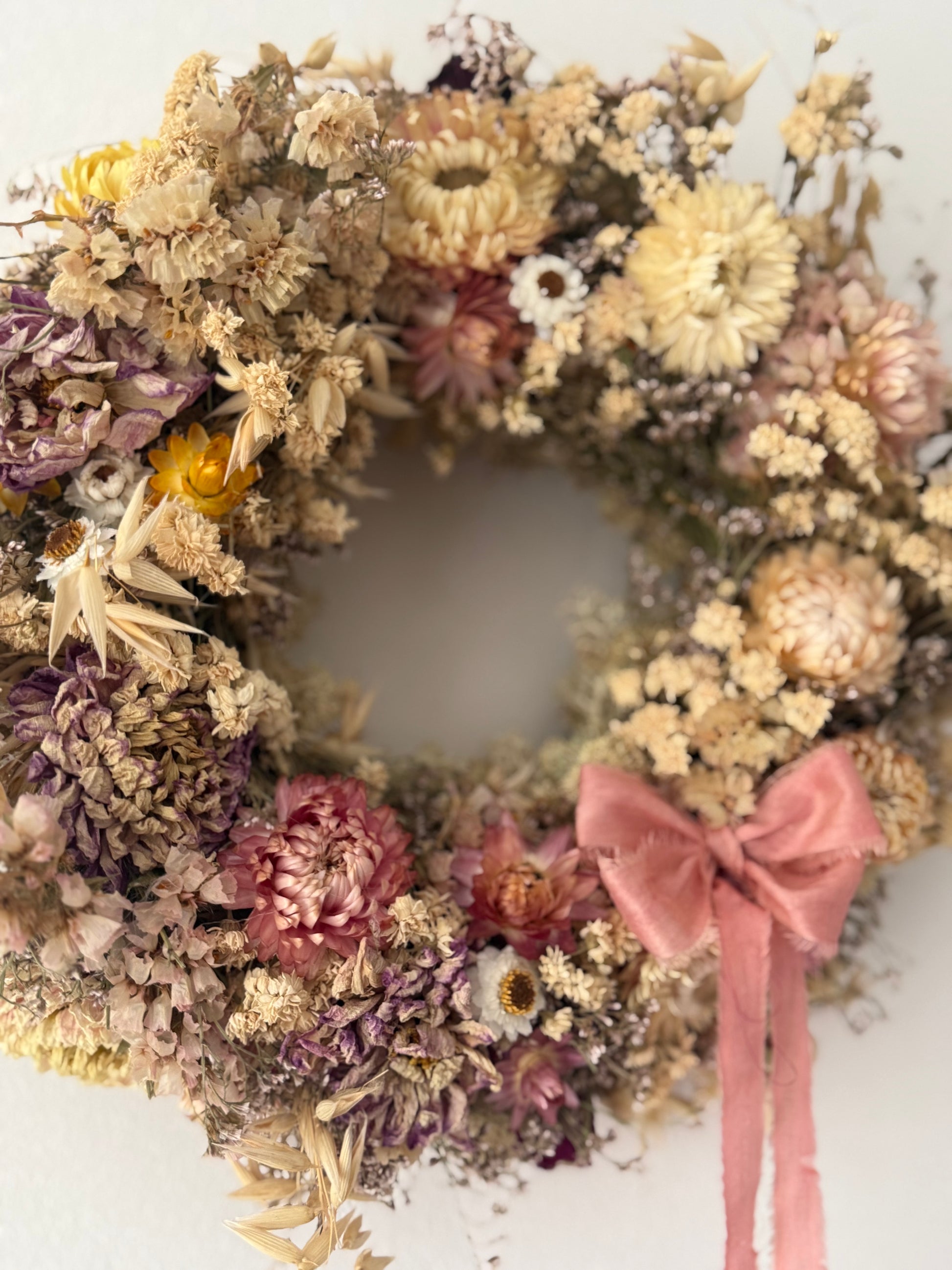 A stunning little wreath with strawflowers, limonium and statice, moss and oats finished with a beautiful silk ribbon.