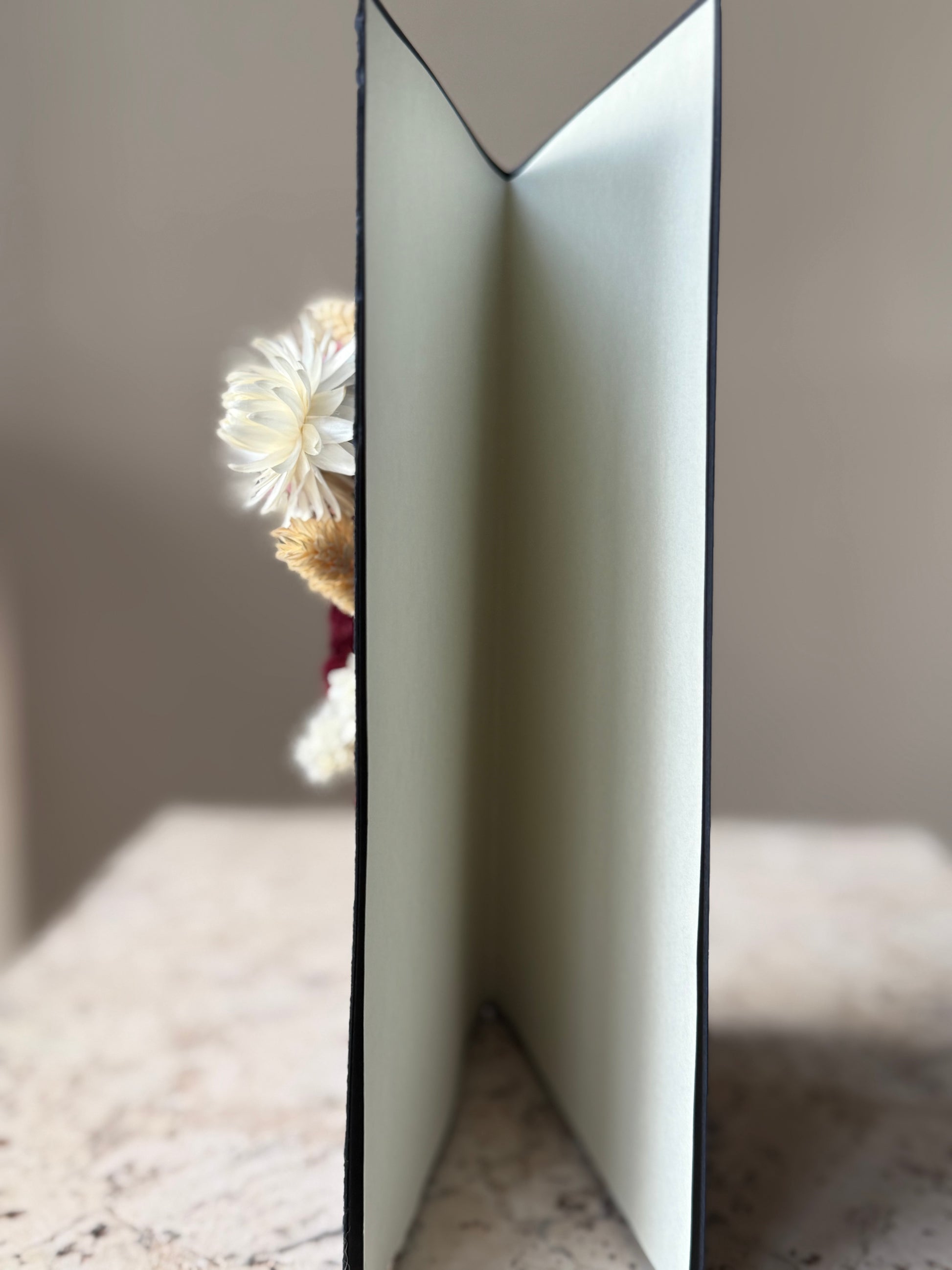 Materials: High quality 300gsm card with hand embossed frame and quality 140gsm insert paper to write your message. Presented in a navy gift box with acetate window.