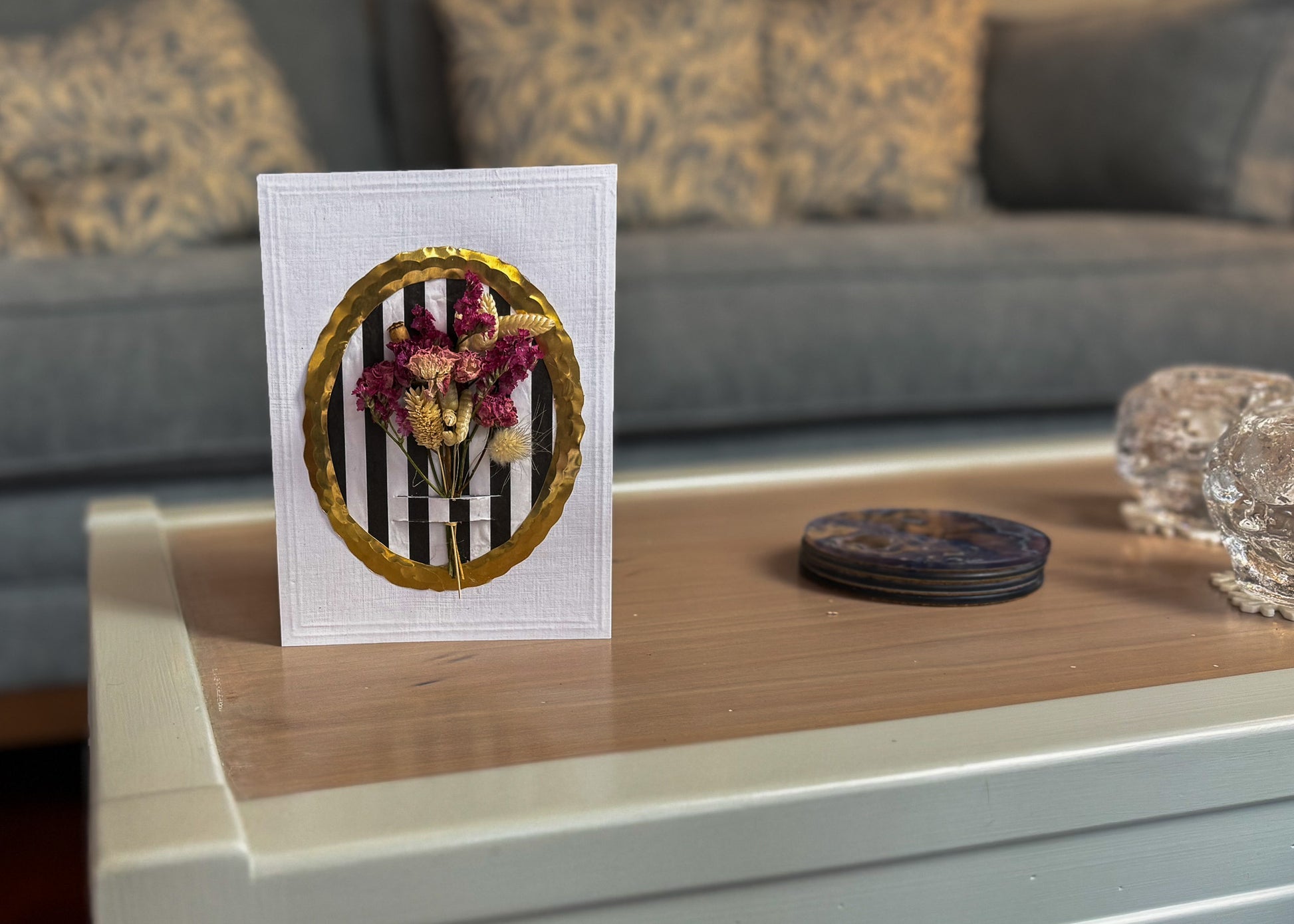 Materials: High quality 300gsm card with hand embossed frame and quality 140gsm insert paper to write your personalised message. Hand-cut and hand embossed brass frame surrounding on a black and white striped backing featuring a dried flower mini bouquet. Presented in a white gift box.