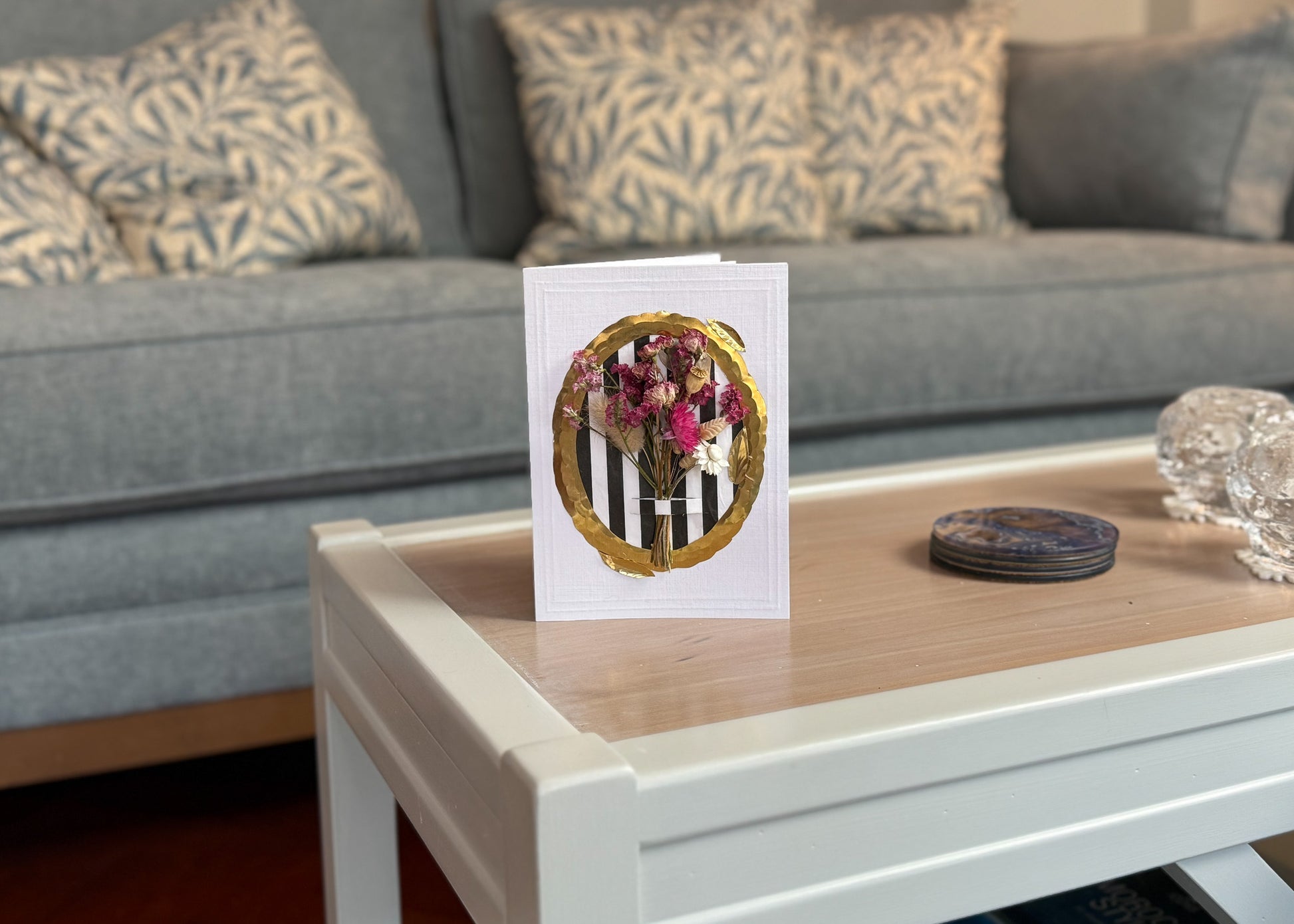 Materials: High quality 300gsm card with hand embossed frame and quality 140gsm insert paper to write your personalised message. Hand-cut and hand embossed brass frame surrounding on a black and white striped backing featuring a dried flower mini bouquet. Presented in a white gift box.