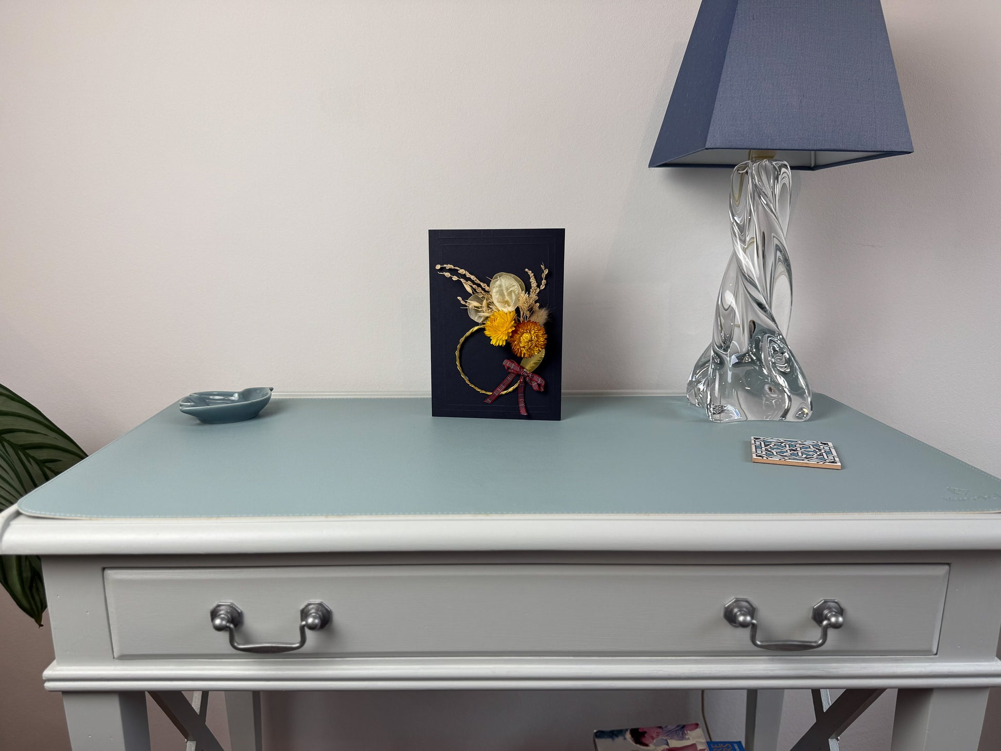 Materials: High quality 300gsm card in navy blue with hand embossed frame and quality 140gsm linen insert paper in ivory. Blank to write your message.
